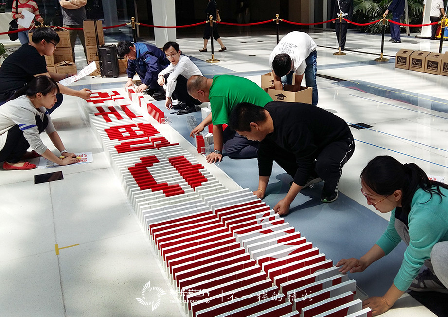 活動自上午九點開始,在火爆的團隊熱身和系統的骨牌技術培訓后,所有隊員全身心的投入到骨牌的碼放中,歷經三個多小時不懈的努力,經歷了一次次骨牌意外的傾覆,終于在下午兩點的時候將一萬二千余枚多米諾骨牌全部碼放完成。在全場數百人“5·4·3·2·1·”的倒計時聲中,象征著在經歷挫折后才能達到美好的希望的彩虹啟動了整場多米諾骨牌表演,最先展現的是金隅嘉華大廈和金隅集團的LOGO,然后是全場技術最為復雜,有著23個分支點的代表團結協作的四手相握圖案,骨牌繼續前行,一幅巨幅多米諾畫面呈現在大家面前,“紀念五四運動96周年” 的標語和團徽在在中國地圖的映襯下閃閃發光,最后,寫有五四精神“愛國、進步、民主、科學”的八面旗幟隨著骨牌的行進順序彈起,豎立在場地中央。在全場熱烈的掌聲中將此次紀念“五四青年節”的活動推向高潮。