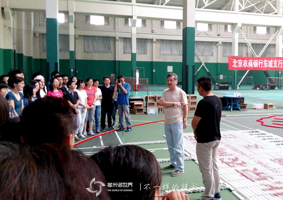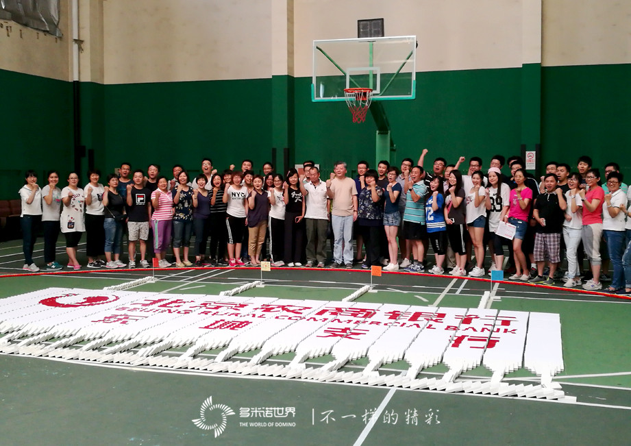 隨后的團體挑戰項目,四支隊伍共同完成了一幅多米諾畫卷,畫卷上既有代表四支隊伍的四色小人,又有“厚德、益眾、善行、致遠”的企業精神,還有寓意著團結、力量的拳頭圖案,在一道靚麗的彩虹下,巨幅的北京農商行東城支行LOGO畫面,憧憬著北京農商行彩虹般美好的未來。