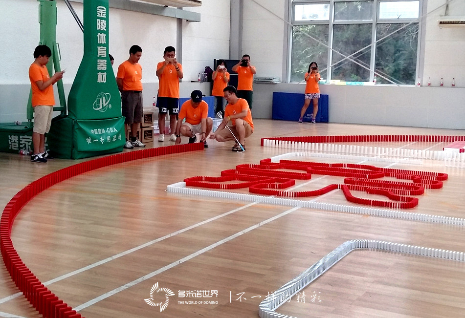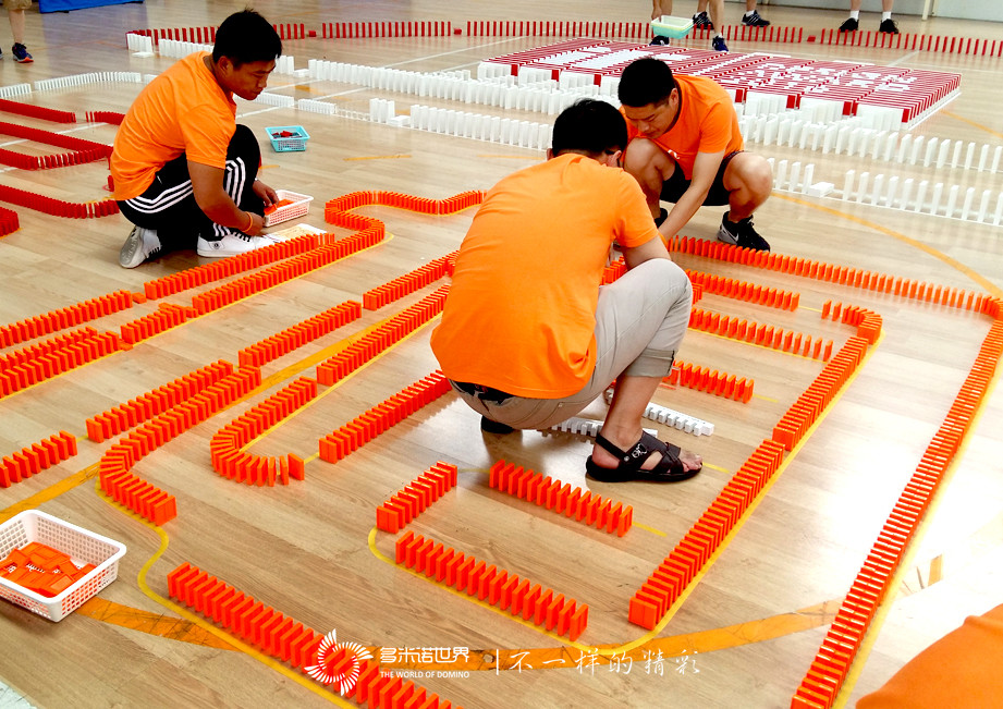 在各隊隊長的帶領下,隊員們來到了自己的任務區域,有條不紊的開始了骨牌碼放工作。有著專業老師的指導,帶著一往無前的熱情,骨牌很快便碼滿了整片場地。當大家都在關注正在做最后連接的幾名隊員之時,當大家都以為翹首以盼的成功馬上就要到來之時,一個小小的失誤給一幅骨牌圖案帶來了災難性地破壞,一枚骨牌的意外倒地,令旁邊的所有骨牌順勢傾倒。與此同時,場地另一邊連接的隊員似乎受了干擾,也出現了失誤,現場瞬間凝固……