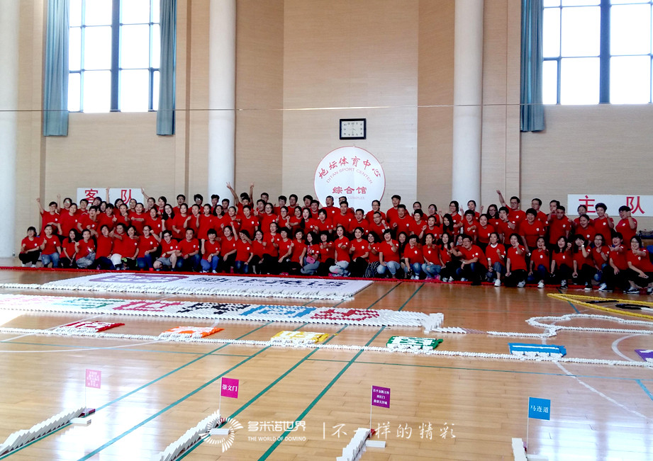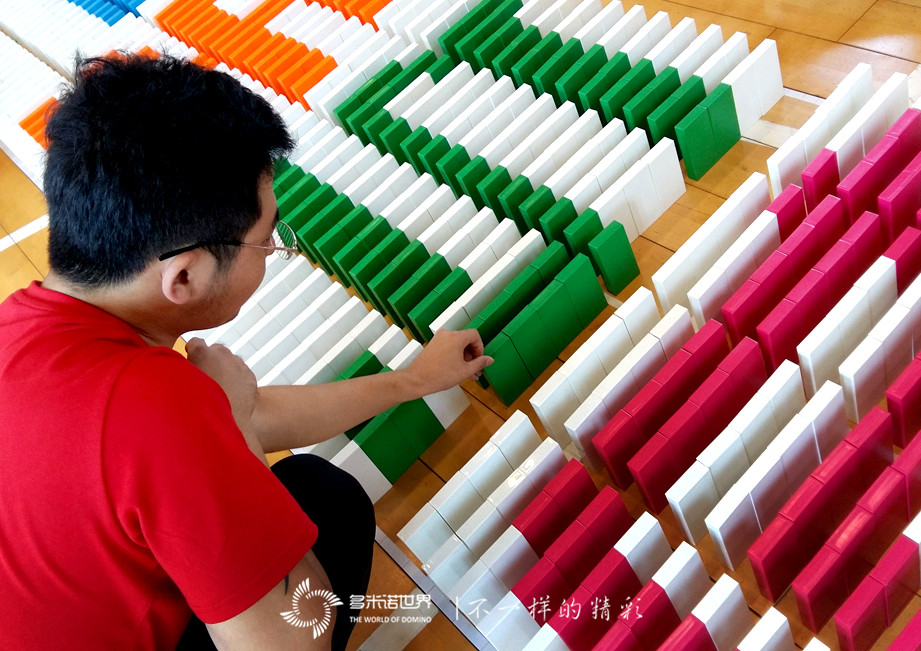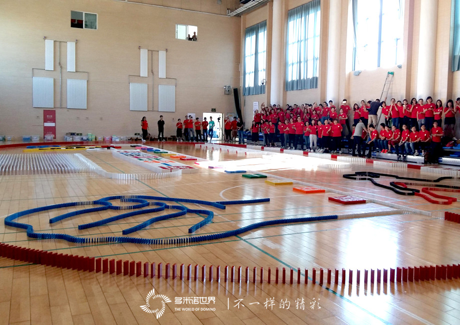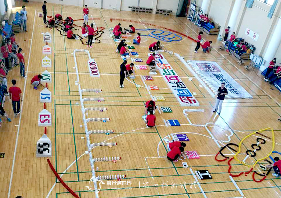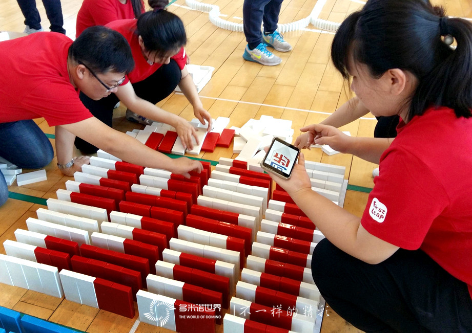 雖然大家都是第一次接觸多米諾運動,卻很快地掌握了骨牌的基本碼放方法,并能夠專注地碼放每一枚骨牌。雖然過程中也有失敗,但意外倒塌的骨牌并沒有打倒大家的自信,而是總結經驗、從頭再來。在大家的齊心協力、共同努力下,一幅幅多米諾畫面成功碼放在地面上。