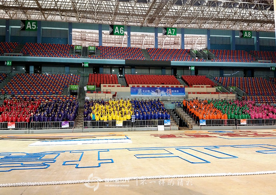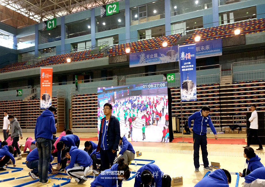 近2000平方米的體育館里,大家經(jīng)過(guò)不到三個(gè)小時(shí)的挑戰(zhàn)時(shí)間,成功擺放了8萬(wàn)余枚多米諾骨牌,通過(guò)拉桿啟動(dòng)裝置啟動(dòng)后,依次展現(xiàn)出醒目的“贏無(wú)止境,領(lǐng)航未來(lái)”,2015 OBU,巨型航母等圖案,整個(gè)表演時(shí)間長(zhǎng)達(dá)3分多鐘,骨牌畫(huà)面采用輪廓型擺放,分支近百個(gè),總長(zhǎng)接近1公里,所有的骨牌無(wú)一缺失地百分百完美展現(xiàn)成功。