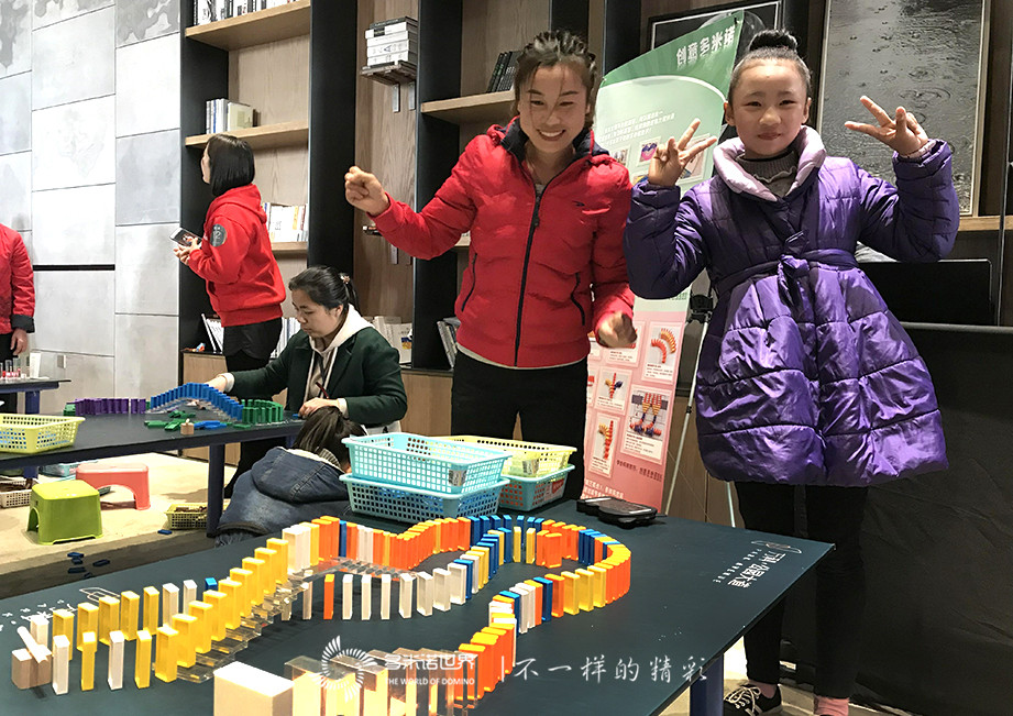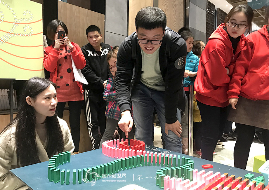在這個五彩繽紛的“多米諾世界”,不同顏色不同大小的骨牌,組成的各式各樣的造型、圖案隨處可見。紛繁而至的多米諾愛好者,或組成參賽隊,在各自的賽場爭分奪秒、展開奇思妙想;或流連多米諾體驗區,與骨牌親密接觸,久久不舍離去。